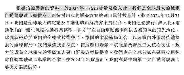 根据灼识谘询的资料,于2024年,按出货量及收入计,伯镭科技是全球最大的纯电自动驾驶矿卡提供商,而按采用公司解决方案的矿山累计数量计,截至2024年12月31日,其是全球最大的电动及自动化矿山解决方案提供商。按2024年出货量计,公司亦是中国第二大自动驾驶矿卡解决方案提供商。