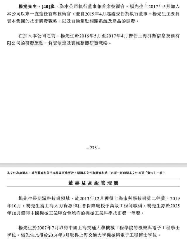杨扬,40岁,为公司执行董事兼首席技术官、联合创始人。杨扬自2017年5月加入公司以来一直担任首席技术官,并自2019年4月起获委任为执行董事。杨扬主要负责集团的技术研发战略,以及自动驾驶相关系统及产品的开发。