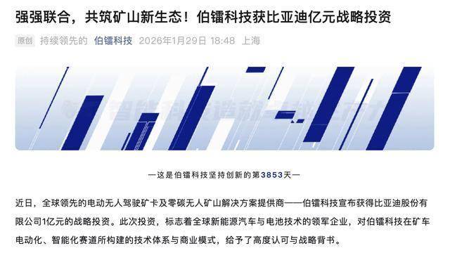 值得一提的是,1月29日,伯镭科技宣布于近日获得比亚迪股份有限公司1亿元的战略投资。此次投资,标志着全球新能源汽车与电池技术的领军企业,对伯镭科技在矿车电动化、智能化赛道所构建的技术体系与商业模式,给予了高度认可与战略背书。