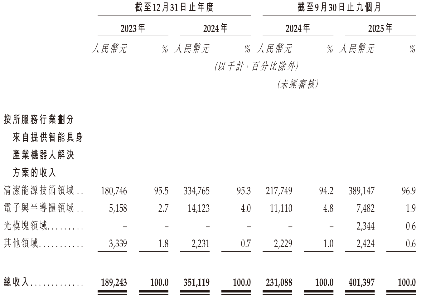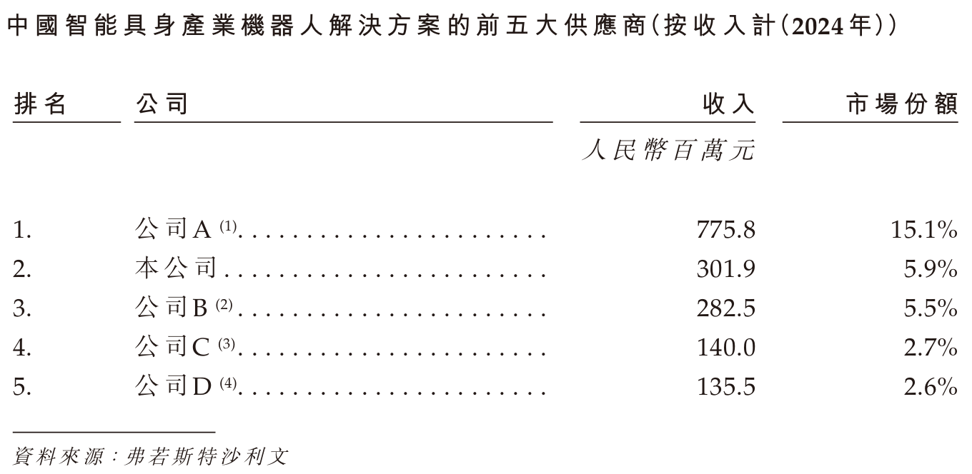 报告期内,玖物智能收入实现较快增长:2023年约为2.07亿元,2024年达到3.66亿元,2025年前三季度为4.10亿元;净利润从913.3万元增至3264万元,2025年前三季度为2546.8万元。公司按2024年收入计,在中国智能具身产业机器人解决方案领域排名第二,市场份额5.9%。