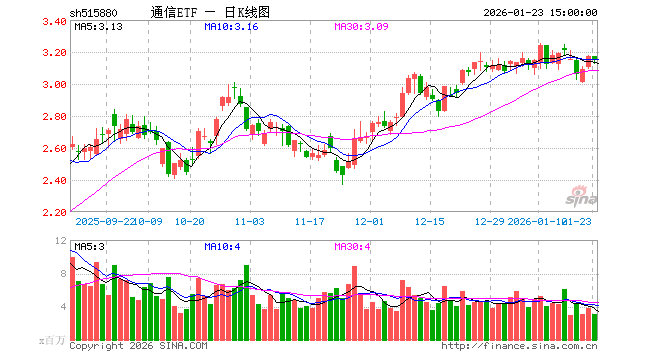 1月23日,通信ETF(515880)跌0.85%,成交额9.86亿元。当日份额增加5500.00万份,最新份额为45.34亿份,近20个交易日份额减少3500.00万份。最新资产净值计算值为142.58亿元。