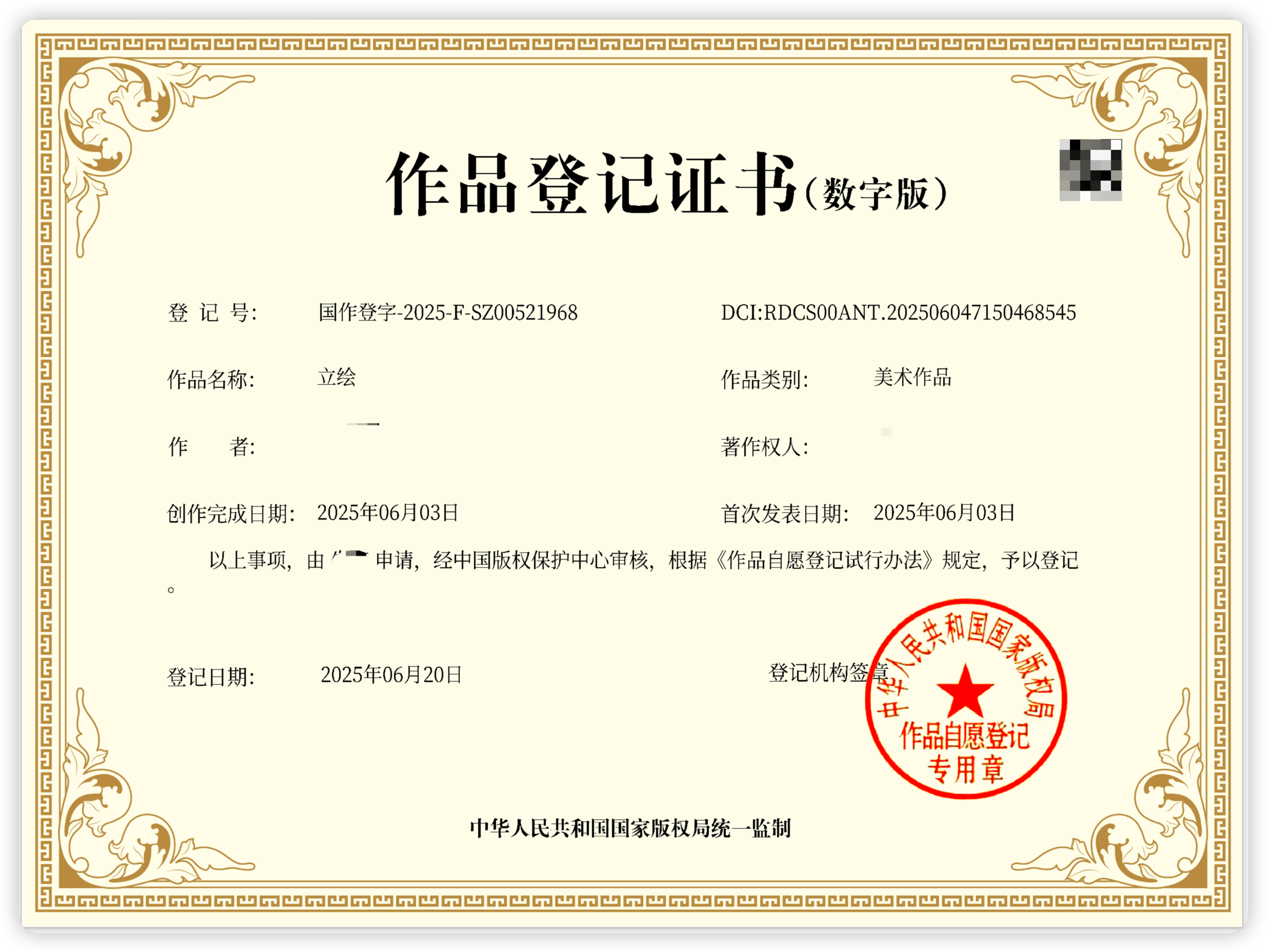 3.完整的数字版权证书总共有3张证:DCI 证书、作品登记证书、作品样本证书。