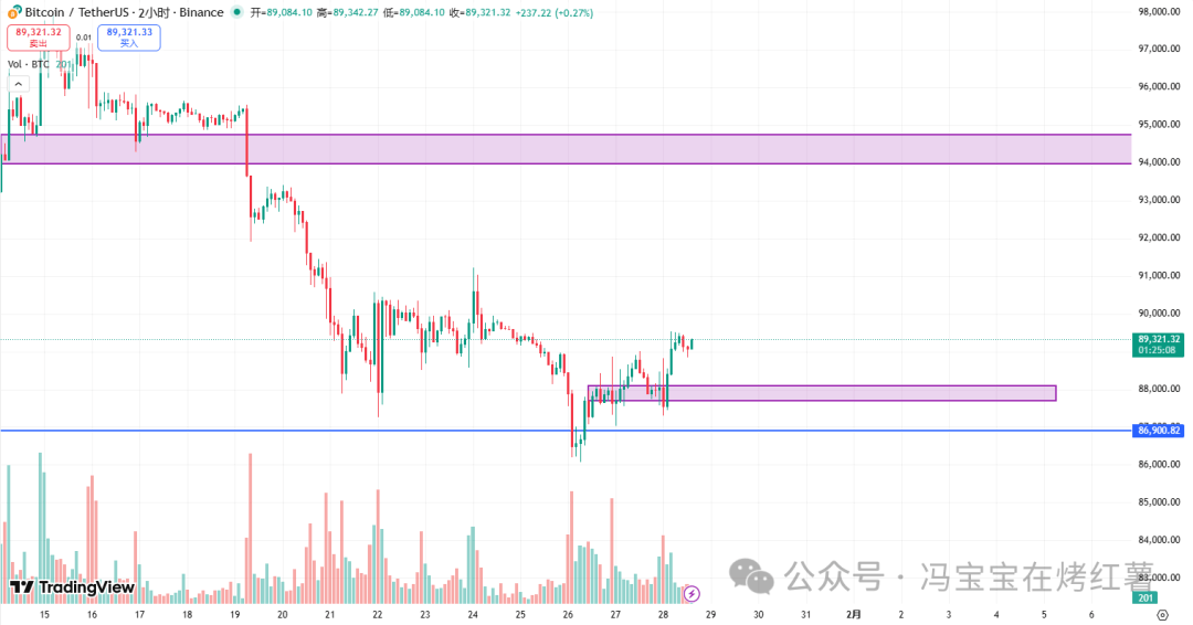 昨天比特币给的是87900支撑,最低打到87265开始反弹到89000上方,今天关注88100-87700的位置能否再次作为一个支撑上去,插针留意86900支撑,上方压力90600。