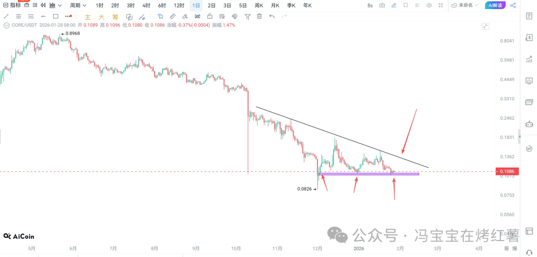 短期来说CORE,这位置有个收敛形态,支撑压力都是明显的,如果撑住了,能突破上方的压力位,那行情后续还能涨一些。