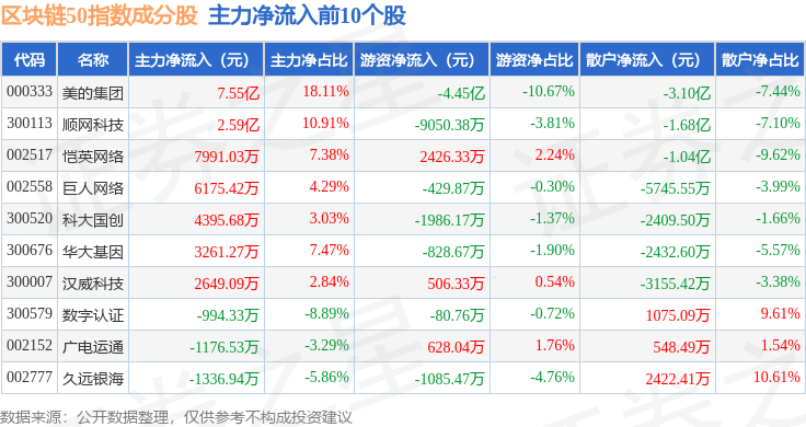 资金流向方面,区块链50(399286)指数成份股当日主力资金净流出合计48.2亿元,游资资金净流入合计9.93亿元,散户资金净流入合计38.26亿元。成份股资金流向详情见下表: