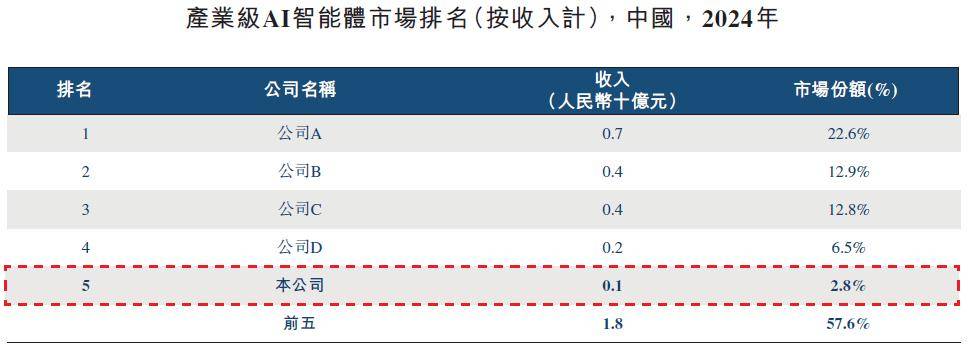 据弗若斯特沙利文报告显示,2024年中国产业级AI智能体市场的规模为31亿元,海致科技以1亿元的收入和2.8%的市场份额排名第五。