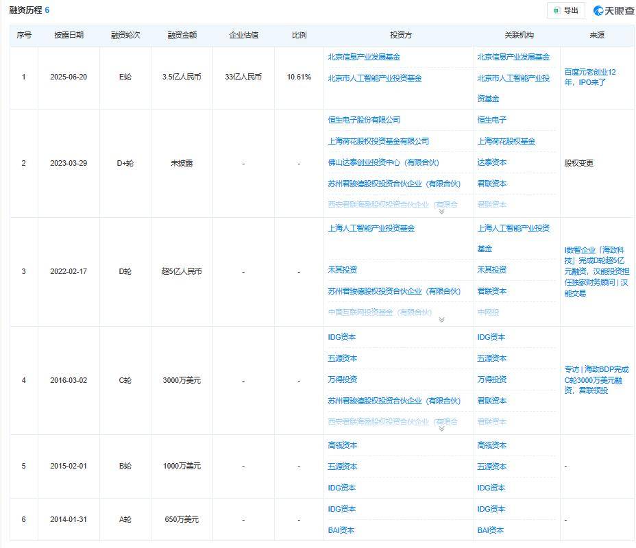 海致科技不仅迅速获得了来自百度系资源的支持,更吸引了包括IDG资本、BAI、君联资本、高瓴等一线投资机构的持续加注。2025年6月,海致科技完成了3.5亿元E-2融资,投后估值为33亿元。
