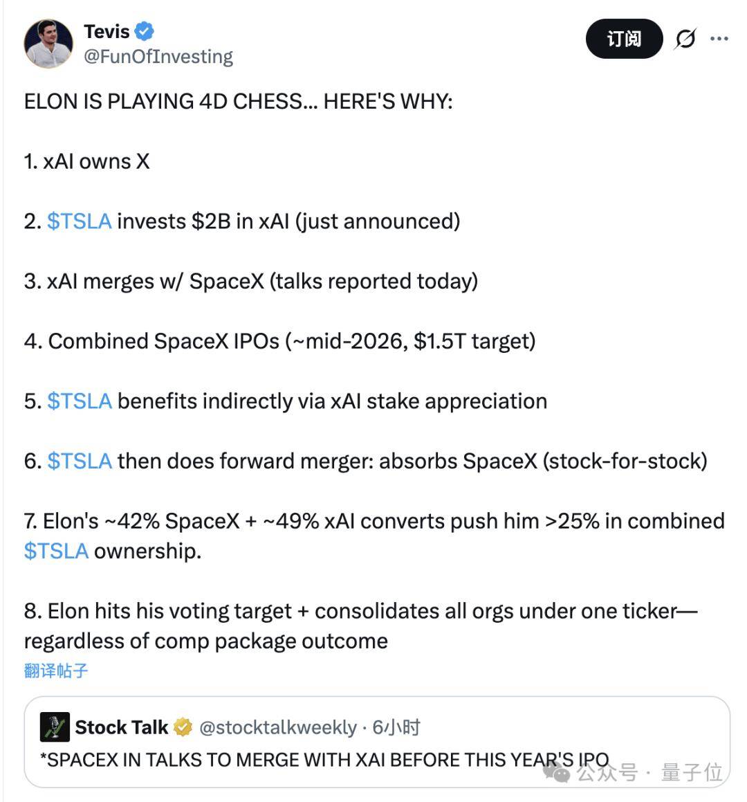 正如这位网友评论的那样,马斯克正在下一盘“4D大棋”,其终局是将所有组织整合到一个股票代码之下,从而达成他对整个商业帝国的绝对控制。