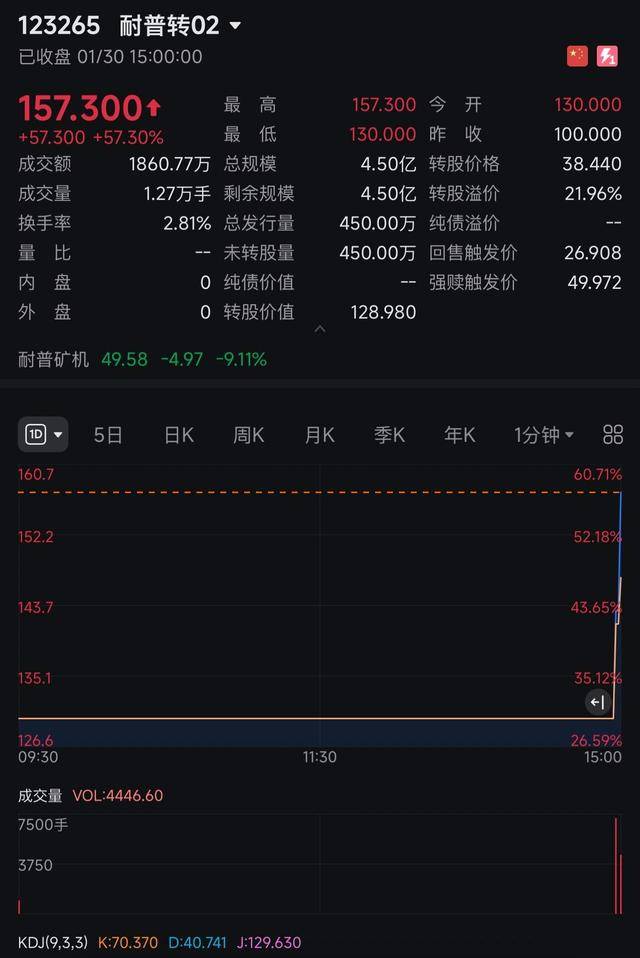 发行价:100元;开盘价:130元;收盘价:157.3元;涨幅:57.3%