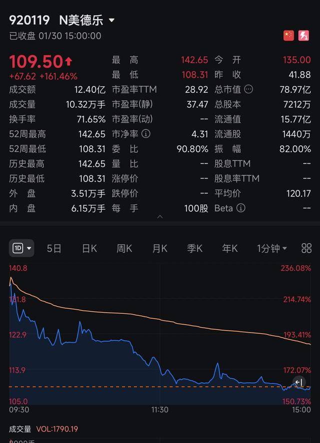 发行价:41.88元;开盘价:135元;收盘价:109.5元;涨幅:161.5%