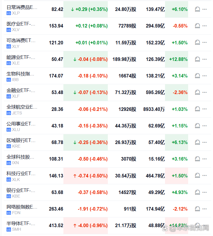 半导体ETF跌0.96%,在美股盘初领跌行业ETF,网络股指数ETF、银行业ETF、科技行业ETF、全球科技股指数ETF等至多跌0.72%。