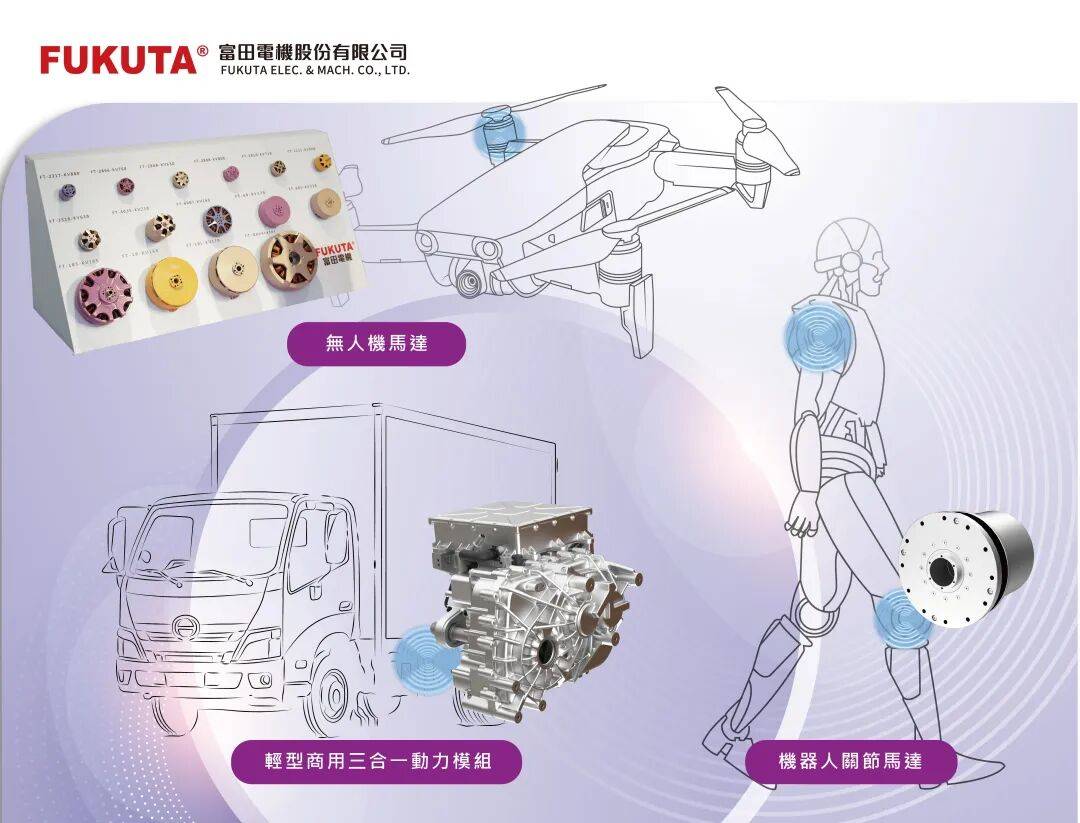 富田电机主要业务涵盖工业用电动马达(马达)的设计与生产、电动载具马达及动力系统的研发与制造,以及电动载具与工业马达的性能测试验证。近年来积极布局无人机、低轨卫星、机器人等新兴领域,成立小型化事业部拓展相关应用。