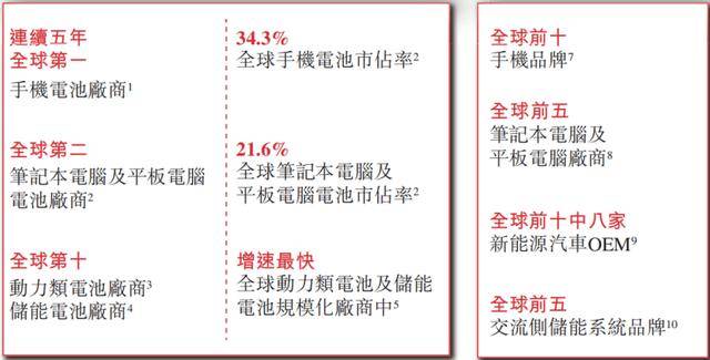 按2024年手机、笔记本计算机及平板计算机相关电池出货总量计,欣旺达已成为全球最大的锂离子电池厂商。根据灼识咨询的数据,按2024年出货量计,公司在全球手机电池市场独占鳌头,市占率高达34.3%。根据同一资料来源,公司是全球第二大的笔记本计算机及平板计算机电池厂商,市占率高达21.6%。