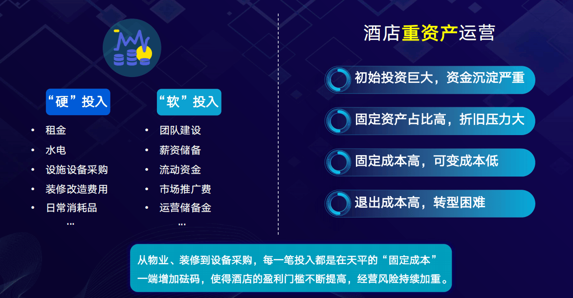 传统酒店业是个典型的“重资产”行业。开一家酒店,意味着巨额的“硬”投入和“软”投入: