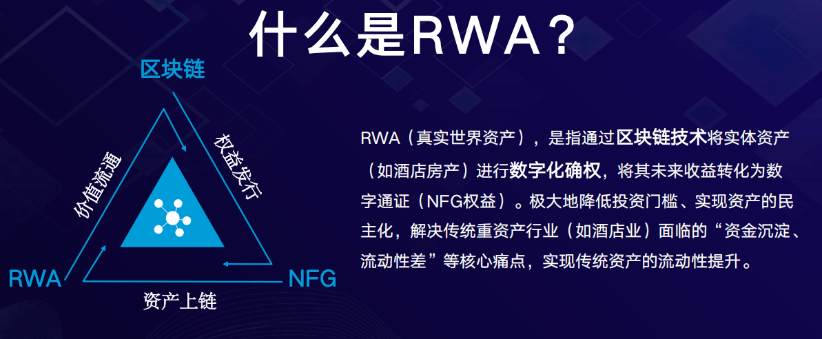 RWA,即 “真实世界资产” 。简单来说,就是通过区块链技术,将实体资产(如酒店未来的房间收益权)进行数字化确权,转化为一份份可交易的数字权益凭证(NFG)。