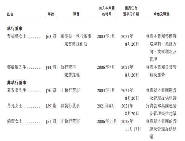 曹梅盛,63岁,为公司的联合创始人、董事长、执行董事兼首席技术官。她于2003年1月加入集团,并共同领导公司的股份制改革(于2004年改制为有限责任公司,后于2023年在上海证券交易所上市)。她自2003年1月至2021年8月先后任公司董事长、总经理、执行董事等职位,自2021年8月至今任董事长、首席技术官。曹女士亦在公司多家子公司担任董事职务。