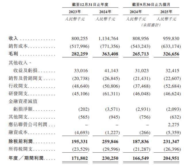 业绩方面,2023年、2024年及2025年前9个月,浙江荣泰的营业收入分别为8亿元、11.35亿元及9.60亿元;利润分别为1.72亿元、2.30亿元及2.05亿元。