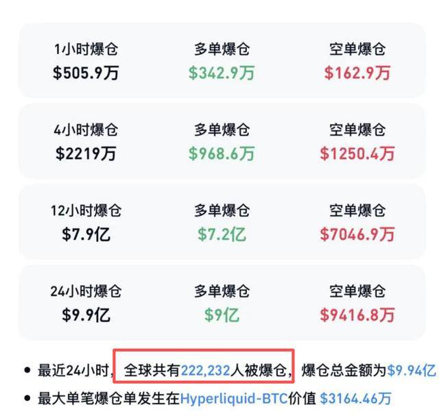 Coinglass的数据让人触目惊心:24小时内,22万人爆仓,总金额9.94亿美元。