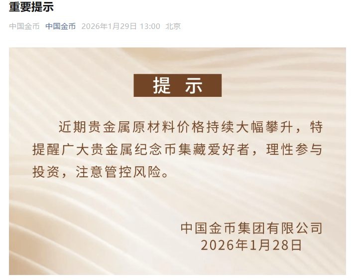 近期贵金属原材料价格持续大幅攀升,特提醒广大贵金属纪念币集藏爱好者,理性参与投资,注意管控风险。