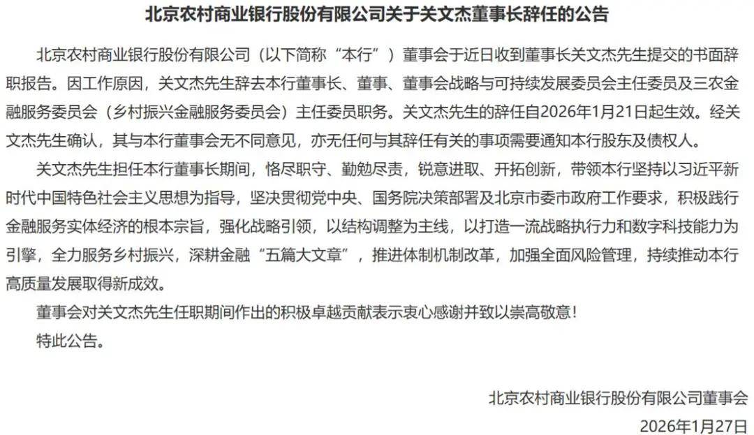 1月27日,北京农商行在其官网发布《关于关文杰董事长辞任的公告》,称因工作原因,关文杰辞去该行董事长等行内职务,其辞任自2026年1月21日起生效。公告表示,北京农商行董事会对关文杰任职期间作出的积极卓越贡献表示衷心感谢并致以崇高敬意。