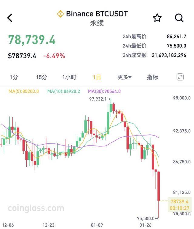 2月1日凌晨,比特币持续跳水,一度跌至75500美元/枚,随后有所回升,截至发稿,比特币跌6.49%,报78739.4美元/枚。