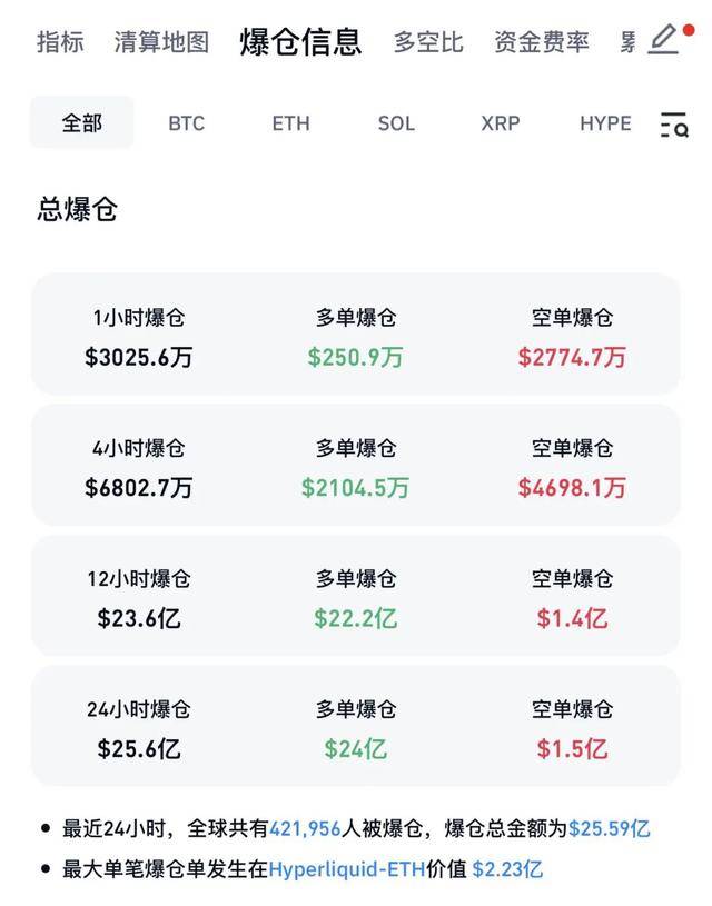 Coinglass数据显示,过去的24小时内,加密货币全网合约爆仓25.59亿美元,爆仓人数超42万人。其中,多单爆仓24亿美元,空单爆仓1.5亿美元。最大单笔爆仓单发生在Hyperliquid-ETH,价值2.23亿美元。
