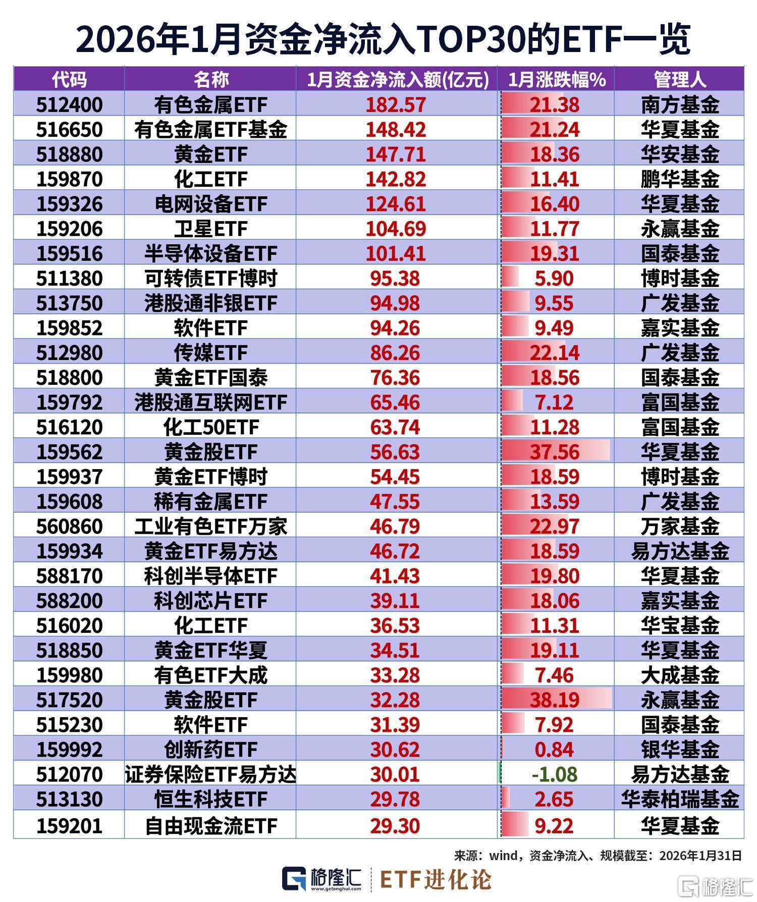 行业主题ETF获得资金净流入。1月,超百亿资金净流入有色金属ETF、有色金属ETF基金、黄金ETF、化工ETF、电网设备ETF、卫星ETF、半导体设备ETF。