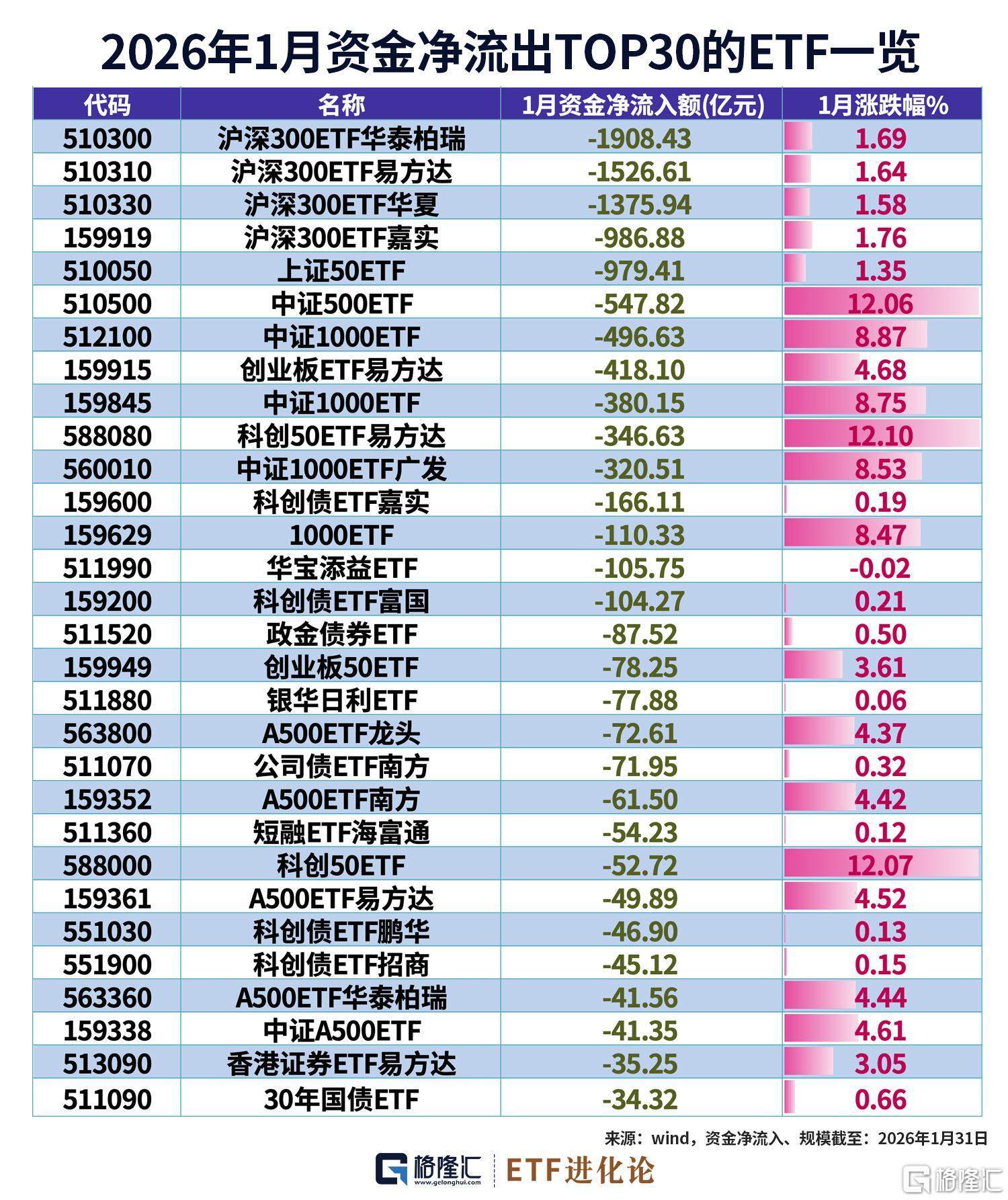 1月份超1万元资金净流出宽基ETF。其中,沪深300、中证1000、上证50ETF出现大额流出。