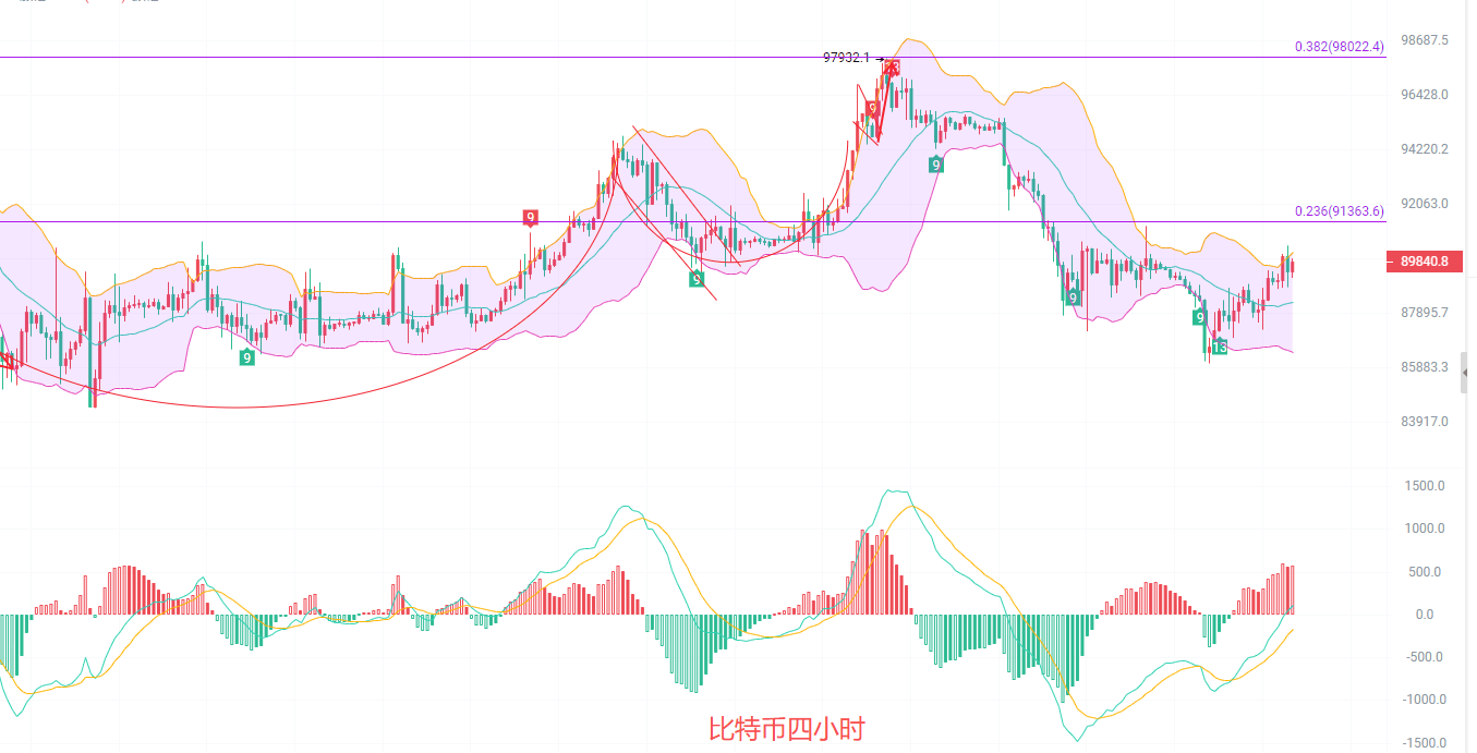 四小时K线来到了EMA趋势指标顶部EMA120一线90460以后出现回调,目前在趋势指标内横盘,MACD连续放量DIF和DEA来到了0轴线附近,同时K线也来到了布林带上轨90138一线受阻,这个位置明显属于短线压力位,而且压力有效可以南下试仓