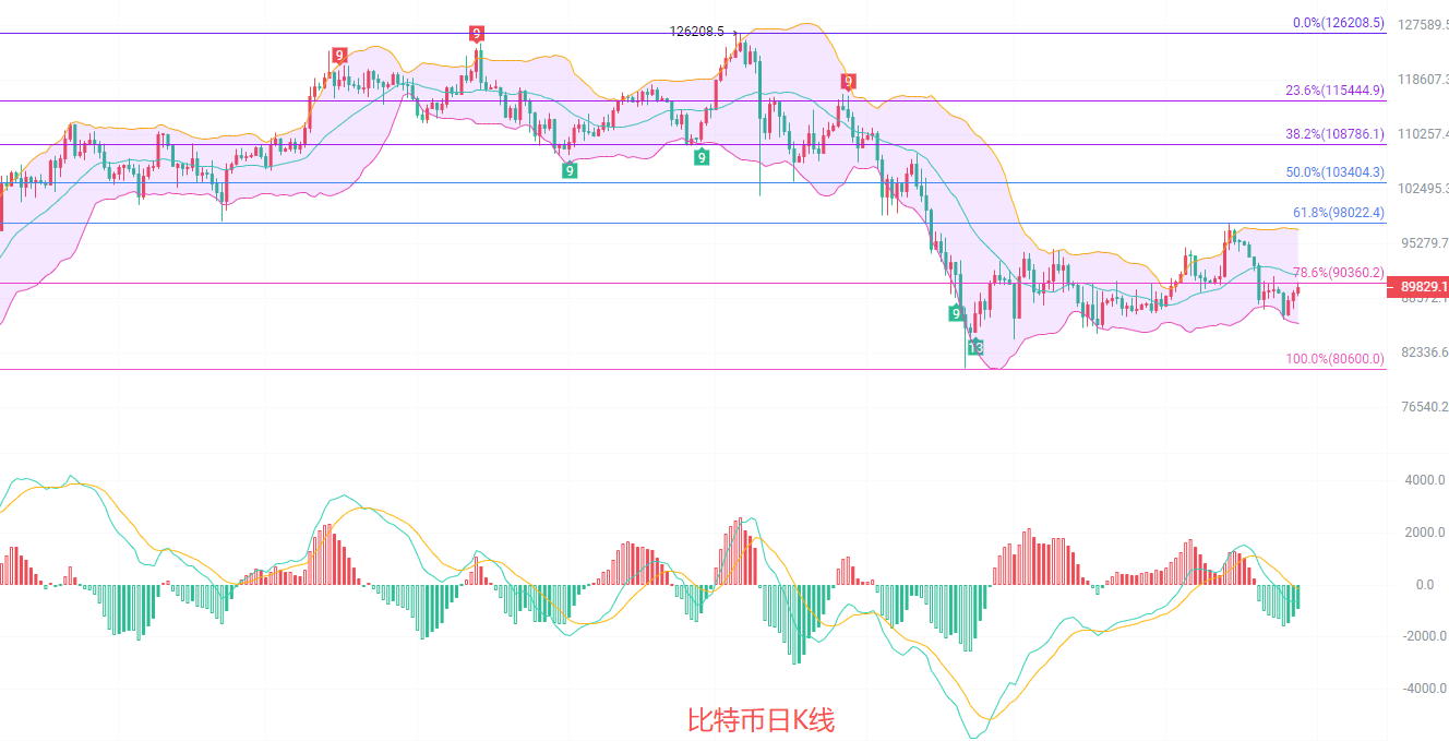 上方90000到91000不破南下,止损400点,目标看89000到88000,破位看87000