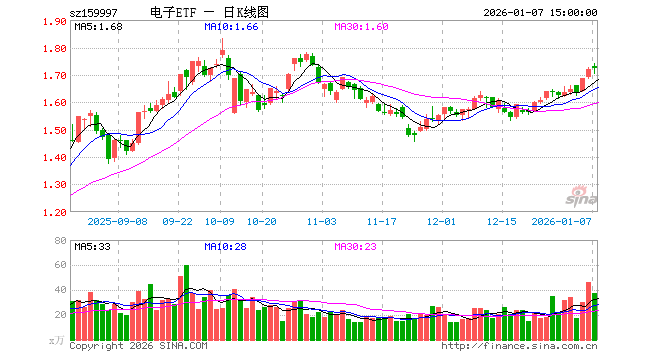 1月7日,电子ETF(159997)涨0.35%,成交额6508.38万元。当日份额增加800.00万份,最新份额为8.22亿份,近20个交易日份额减少2700.00万份。最新资产净值计算值为14.19亿元。