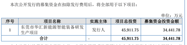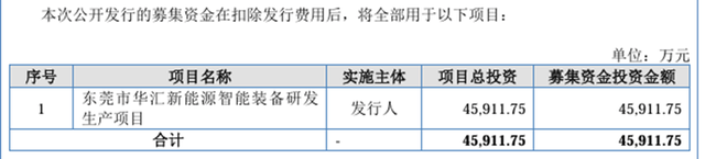 但让人困惑的是,华汇智能在今年1月28日披露的招股书上会稿里却削减了募资计划。在去年3月12日提交的招股书申报稿里,该公司的募投项目“东莞市华汇新能源智能装备研发生产项目”的募资计划是45,911.75万元,这也是该项目的总投资金额。也即这个项目全部由募资来投入。