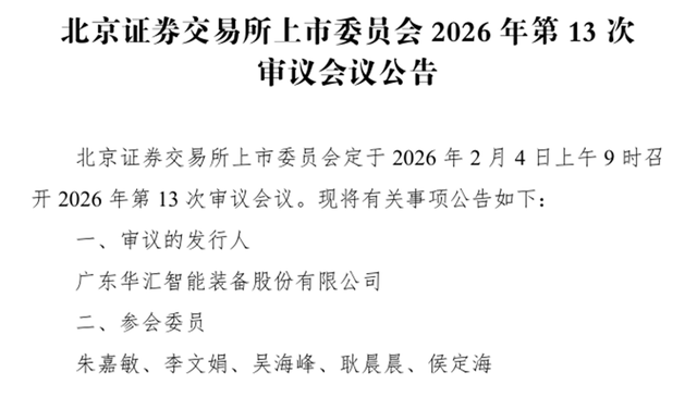根据北交所安排,广东华汇智能装备股份有限公司(以下简称“华汇智能”)将于2月4日上会,接受北交所上市委员会召开的2026年第13次审议会议对其首发事宜的审核。