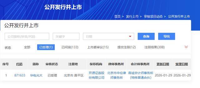 据北交所官网信息,1月29日,北京华电光大环境股份有限公司IPO获得受理,成为2026年首家获受理的北交所IPO申报企业。