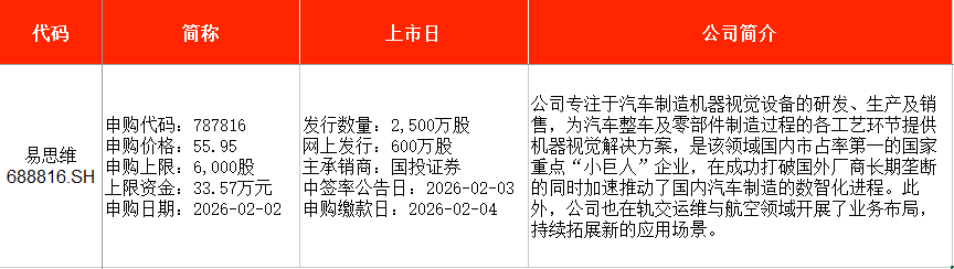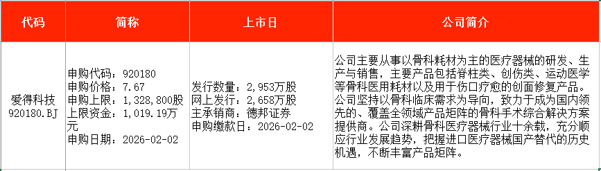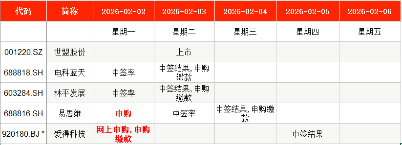 从时间表看,易思维(688816)、爱得科技(920180)均将在本周一(2月2日)申购。