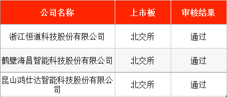 其中,拟在北交所IPO的浙江恒道科技股份有限公司(下称“恒道科技”)、鹤壁海昌智能科技股份有限公司(下称“海昌智能”)、昆山鸿仕达智能科技股份有限公司(下称“鸿仕达”)等均成功过会。