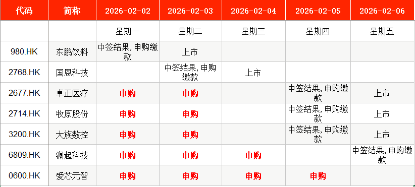 港股方面,Wind数据显示,本周(2月2日至2月6日),卓正医疗(02677.HK)、牧原股份(02714.HK)、大族数控(03200.HK)等均将在本周一至本周二申购。
