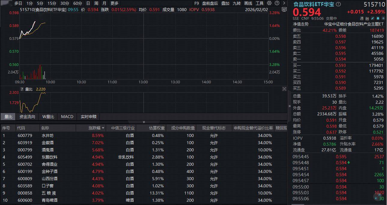 吃喝板块今日(2月2日)再度猛攻,反映吃喝板块整体走势的食品饮料ETF华宝(515710)开盘后直线拉升,盘中场内价格涨幅一度达到3.28%,截至发稿,涨2.59%。