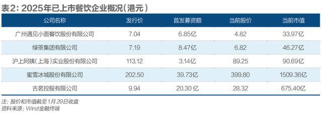 不过,即便在这个窗口期内成功上市,市值管理是这些上市公司更长期的问题。市场数据揭示了上市热潮背后的“冰与火”。Wind(万得)数据显示,2025年上市的古茗、绿茶集团、遇见小面均上市即破发,沪上阿姨首日未破发,但上市五个月后跌破发行价。此外,这批餐企上市之后股价走势的分化持续拉大,有的实现逆势走高,有的则陷入长期低迷。