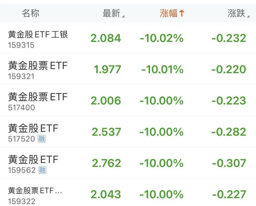 黄金股ETF工银、黄金股票ETF基金等多只黄金股ETF开盘跌停。