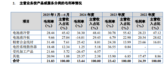 报告期内,新富科技的毛利率分别为25.86%、25.37%、15.94%、21.83%,2024年同比大幅下滑9.43个百分点,毛利率的走低,核心源于公司最主要的两大业务——电池液冷管、电池液冷板的盈利表现恶化,这两项业务报告期内销售收入分别为3.41亿元、4.57亿元、10.42亿元、5.65亿元,合计占当期主营业务收入的75.14%、78.32%、77.86%、72.46%,是公司营收的核心支柱,其中电池液冷板的毛利率下滑尤为严重,报告期内分别为 20.54%、6.79%、-14.01%、9.66%,2024年该产品陷入亏本销售的境地,每销售100元的电池液冷板,公司便会产生14元的亏损。