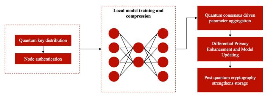 量子共识驱动的参数聚合:压缩后的参数更新被上传至区块链网络,量子拜占庭协议启动共识流程。各节点将参数编码为量子比特序列,通过纠缠交换实现投票信息的实时同步。协议可容忍不超过1/3的恶意节点,并在3轮通信内达成全局一致,较经典PBFT算法效率提升40%。