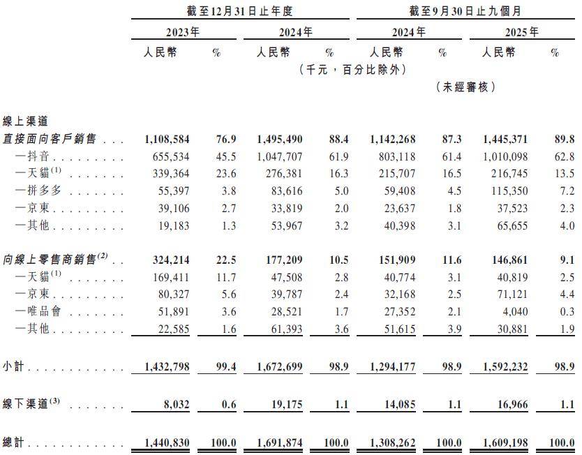从数据看,西子健康的线上渠道收入占比长期稳定在99%左右的惊人高位,线下渠道几乎可以忽略不计。而在线上渠道内部,抖音平台的集中度更是在持续加剧:2023年抖音贡献45.5%的收入,到2024年已猛升至61.9%,而2025年前三季度更达到62.8%,呈现出“越成功越集中”的危险路径依赖。