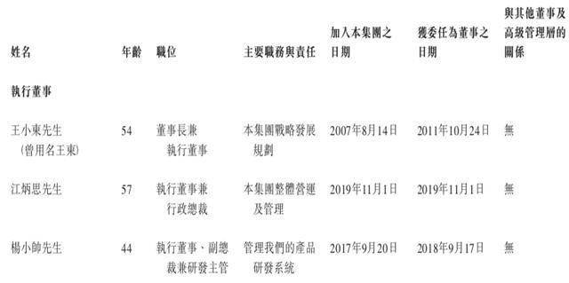 王小东,54岁,董事会主席、执行董事兼提名委员会主席。王小东毕业于东北电力大学电力系统及其自动化专业。创立公司之前,于1990年代在发电厂及通信公司工作,包括呼伦贝尔电业局及中国联合通信有限公司渖阳移动通信分公司。2007年8月至2008年8月担任公司总经理。自2008年8月起,担任执行董事兼董事长。