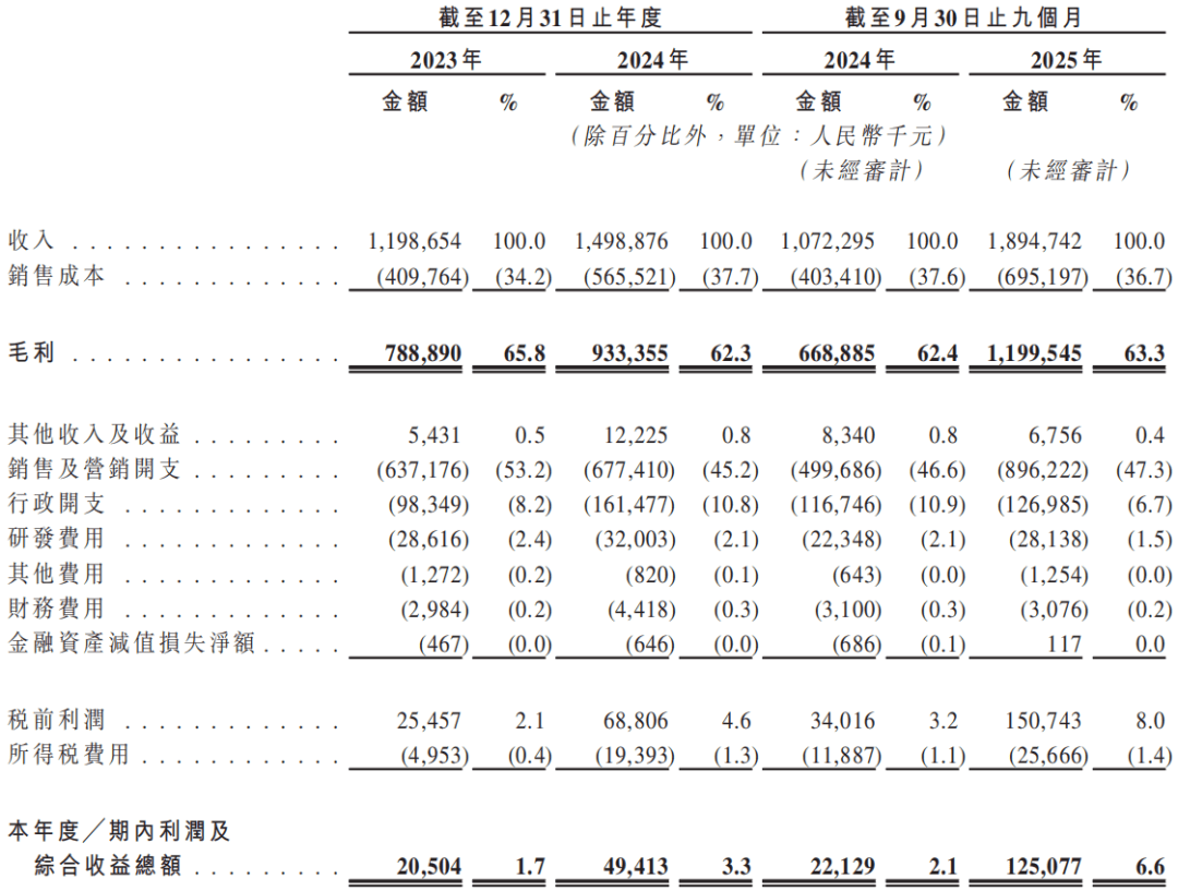 该公司十分依赖线上渠道,2023年、2024年线上渠道收入占比分别为85.7%、75.9%,2025年前9个月线上收入为14.45亿元,占比为76.3%。这种渠道策略使其能够快速触达年轻消费群体,但也带来了渠道依赖风险。