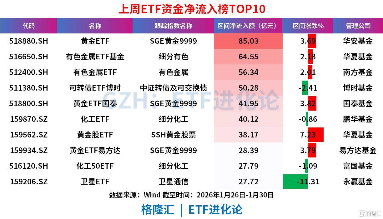 ETF方面,黄金ETF、有色金属ETF基金、有色金属ETF、可转债ETF博时、黄金ETF国泰、化工ETF、黄金股ETF上周分别净流入85.03亿元、64.55亿元、56.34亿元、50.28亿元、41.95亿元、40.12亿元、38.17亿元。