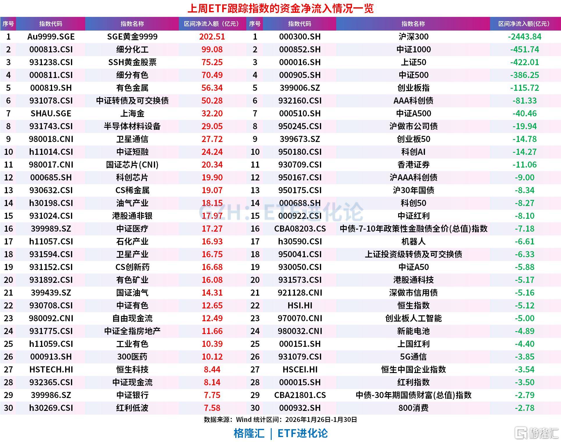 指数方面,SGE黄金9999、细分化工、SSH黄金股票、细分有色、有色金属、中证转债及可交换债、上海金、半导体材料设备上周分别净流入202.51亿元、99.08亿元、75.25亿元、70.49亿元、56.34亿元、50.28亿元、32.20亿元、29.05亿元。
