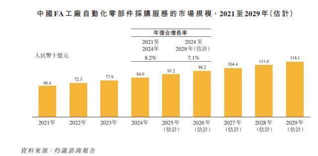 中国FA工厂自动化零部件采购服务的市场规模由2021年的人民币664亿元增加至2024年的人民币840亿元,年复合增长率为8.2%。预期该市场将于2029年达到人民币1181亿元,年复合增长率为7.1%。