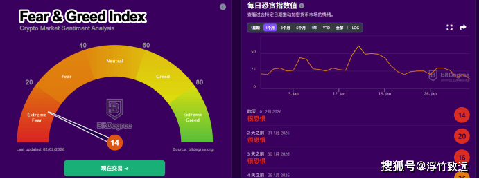 今日全球加密总市值继续缩水到约2.8万亿美元,这轮行情波动从周日的凌晨开始。比特币率先开始跳水,价格一路跌破支撑,在今天早间又砸了一波,最低触及74500美元附近,不少投资者吓得赶紧抛售。好在随后出现小幅反弹,反弹力度不大勉强维持在77000上方。以太坊砸的力度就有点大了,今早最低触及到2150附近了,反弹的力度也弱于比特币,发稿前还没站上2300上方。SOL等山塞币也跟着遭殃,重挫8-10%。 恐惧与贪婪指数直奔14的“极端恐惧”深渊。