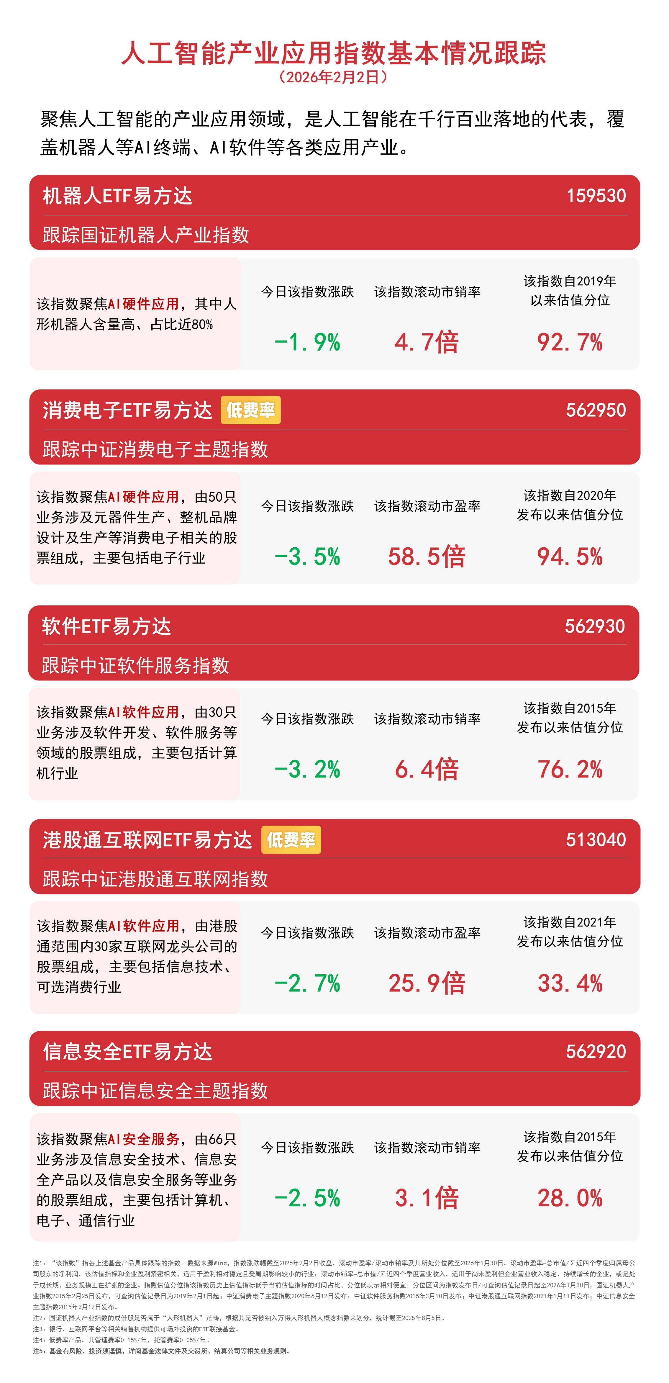 截至收盘,国证机器人产业指数下跌1.9%,中证信息安全主题指数下跌2.5%,中证港股通互联网指数下跌2.7%,中证软件服务指数下跌3.2%,中证消费电子主题指数下跌3.5%。Wind数据显示,软件ETF易方达(562930)和港股通互联网ETF易方达(513040)1月份分别获11.6亿元和16.4亿元资金净流入。